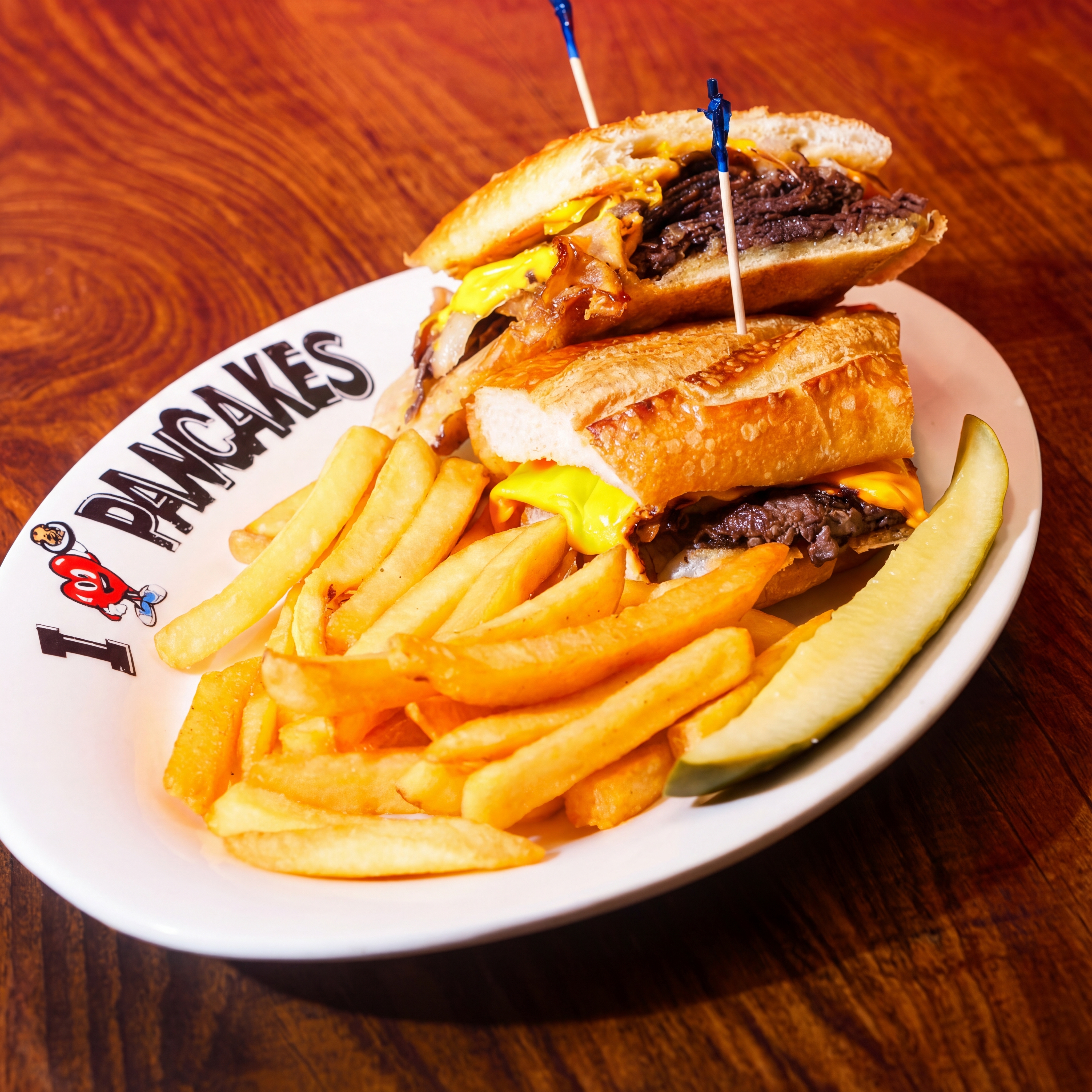 Served with cheese, whiz, mushroom, and onions on a grilled roll